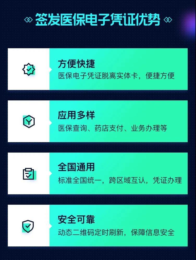 医保电子凭证由国家医保信息平台统一签发,是基于医保基础信息库为全体参保人员生成的医保身份识别电子介质。电子凭证通过实名/实人认证技术,采用加密算法形成电子标识,具备安全可靠、认证唯一等重要特点。
