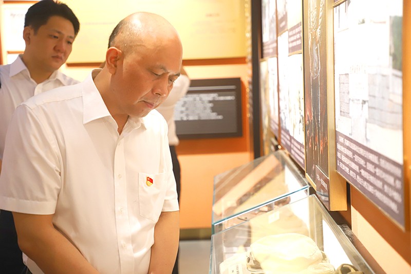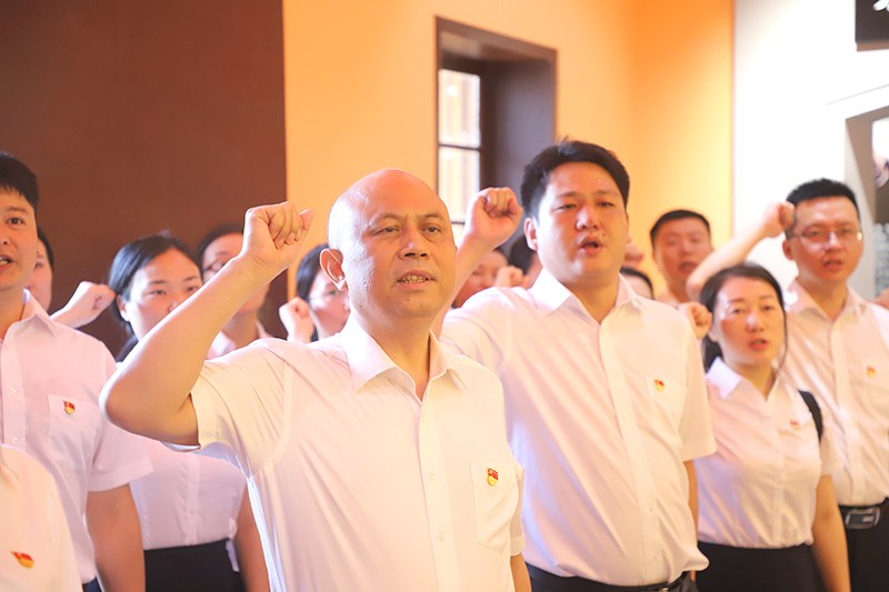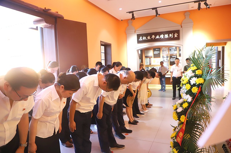 在左权故居,陈志鸿带领全体党员向左权同志铜像敬献花篮,庄严地向左权铜像鞠躬,表达了对革命先辈的敬仰与缅怀之情。随后,全体党员面对鲜红的党旗,庄重地举起右拳,重温入党誓词,铭记入党初心。
