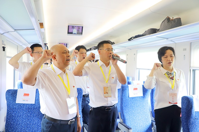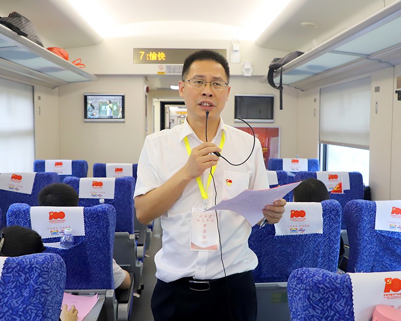 在红色专列上,全体党员参加党史学习教育“车厢课堂”学习,通过重温一遍入党誓词、学习一段中共党史、聆听一路红色党课、宣讲一路红色故事、诵读一篇红色经典、高唱一首红色歌曲、回味一顿红军餐,开展“七个一”系列红色主题活动,缅怀革命先辈光辉壮丽的一生,感悟革命先辈一心向党的政治品格,学习革命先辈艰苦奋斗的优良作风。