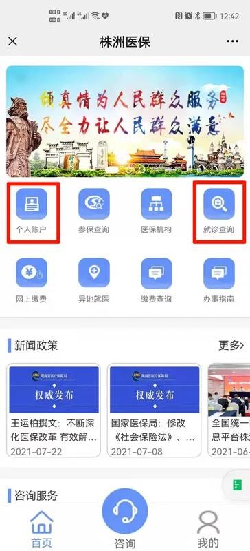 关注“株洲医保”微信服务号,在“智慧医保”模块下“个人账户”查询个人账户金情况,“就诊查询”可以查询个人账户刷卡情况。具体操作步骤情况如下: