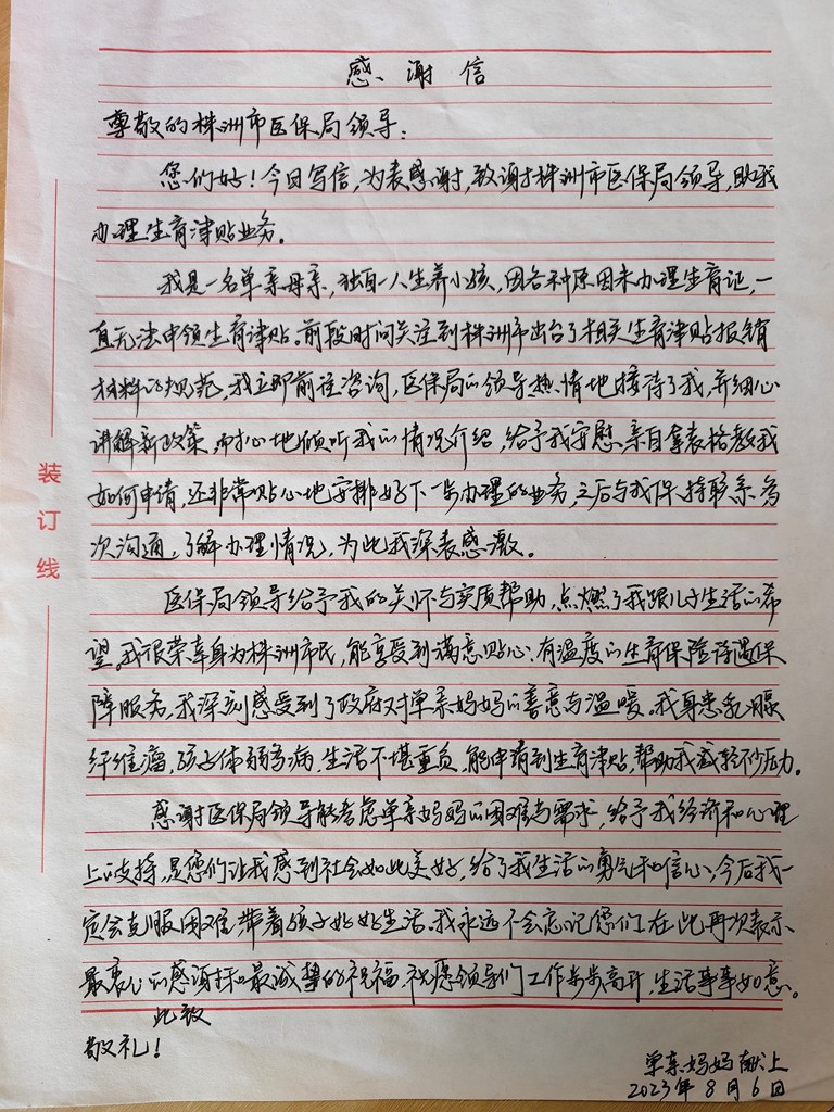 “感谢医保局领导能考虑单亲妈妈的困难与需求,给予我经济和心理上的支持,是你们让我感到社会如此美好,给了我生活的勇气和信心,今后我一定会克服困难,带着孩子好好生活。我永远不会忘记你们。”8月14日,株洲市医疗保障事务中心职工医保科收到了一封手写的感谢信,娟秀整齐的字体间透露着对医保中心工作人员热情贴心帮助其申领生育津贴的满满感激之情。