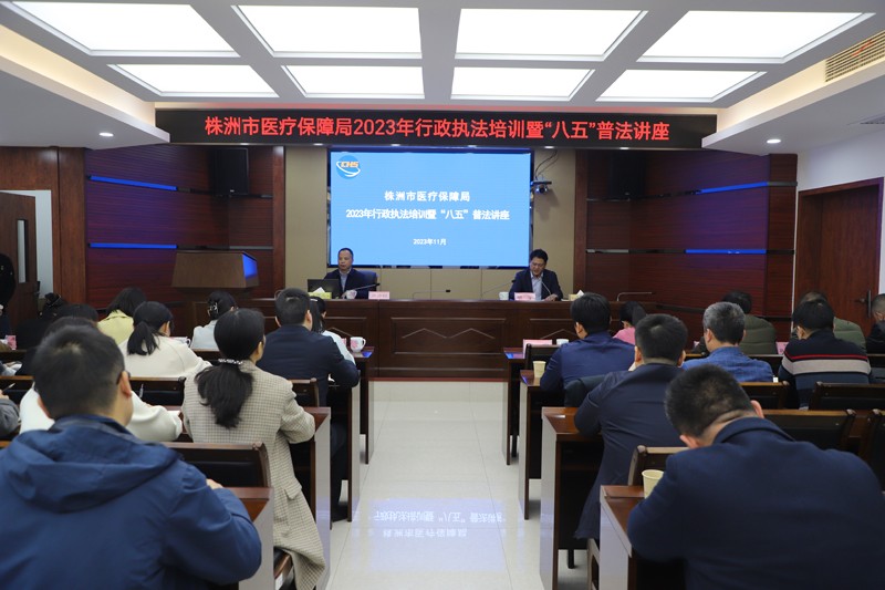 11月14日,株洲市医保局采取“以会代训”方式举办行政执法培训暨“八五”普法讲座,市普法讲师团成员、市司法局党组副书记、副局长肖力钧到会授课,会议由市医保局党组成员、副局长胡宁主持。