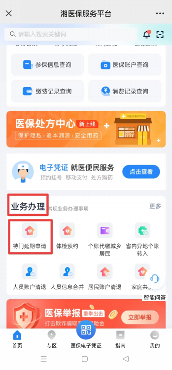 1.下载“湘医保”APP,选择“业务办理”中的“特门延期申请”;或者“株洲医保”微信公众号,点击菜单栏“政民互动”→“服务大厅”→“更多”→“经办业务”→“特门延期申请”。