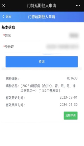 4.“替他人申请”需要输入他人的姓名及身份证号码,查询出该参保人对应的特门待遇后,点击延期申请发起。