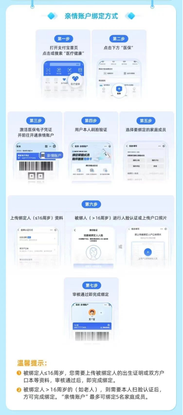 支付宝APP客户端搜索“医保”,点击“医疗健康·医保”进入医保电子凭证(医保码)服务。先激活本人医保电子凭证(医保码),再点击右上角“亲情账户”进入亲情账户服务,按流程绑定家庭成员。