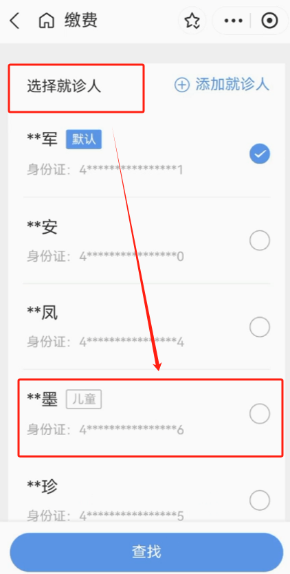 参保人代家庭成员进行医保门诊缴费,在支付宝APP搜索“湖南省直中医院”小程序页面的“门诊缴费”中先切换就诊人,选择要缴费的订单,确认支付。