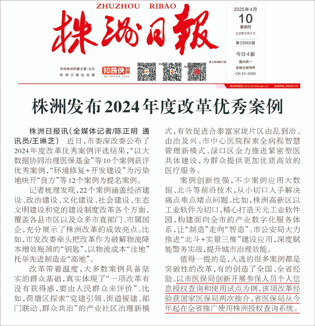 近日,株洲市委深改委在《株洲日报》发布了2024年度改革优秀案例,株洲市医保局“创新开展参保人员个人信息授权查询和使用,守护好老百姓救命钱”的案例获评改革优秀提名案例。该项改革工作作为全国试点项目,以其创新性、安全性和惠民成效,得到国家医保局两次通报表扬并向全国推介经验,省医保局从2024年开始在全省推广株洲经验,株洲医保为全市改革工作再添亮点。