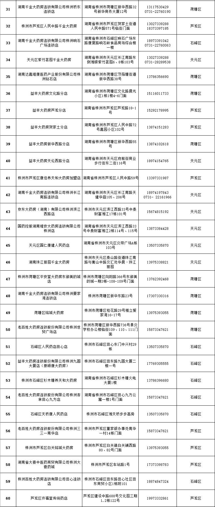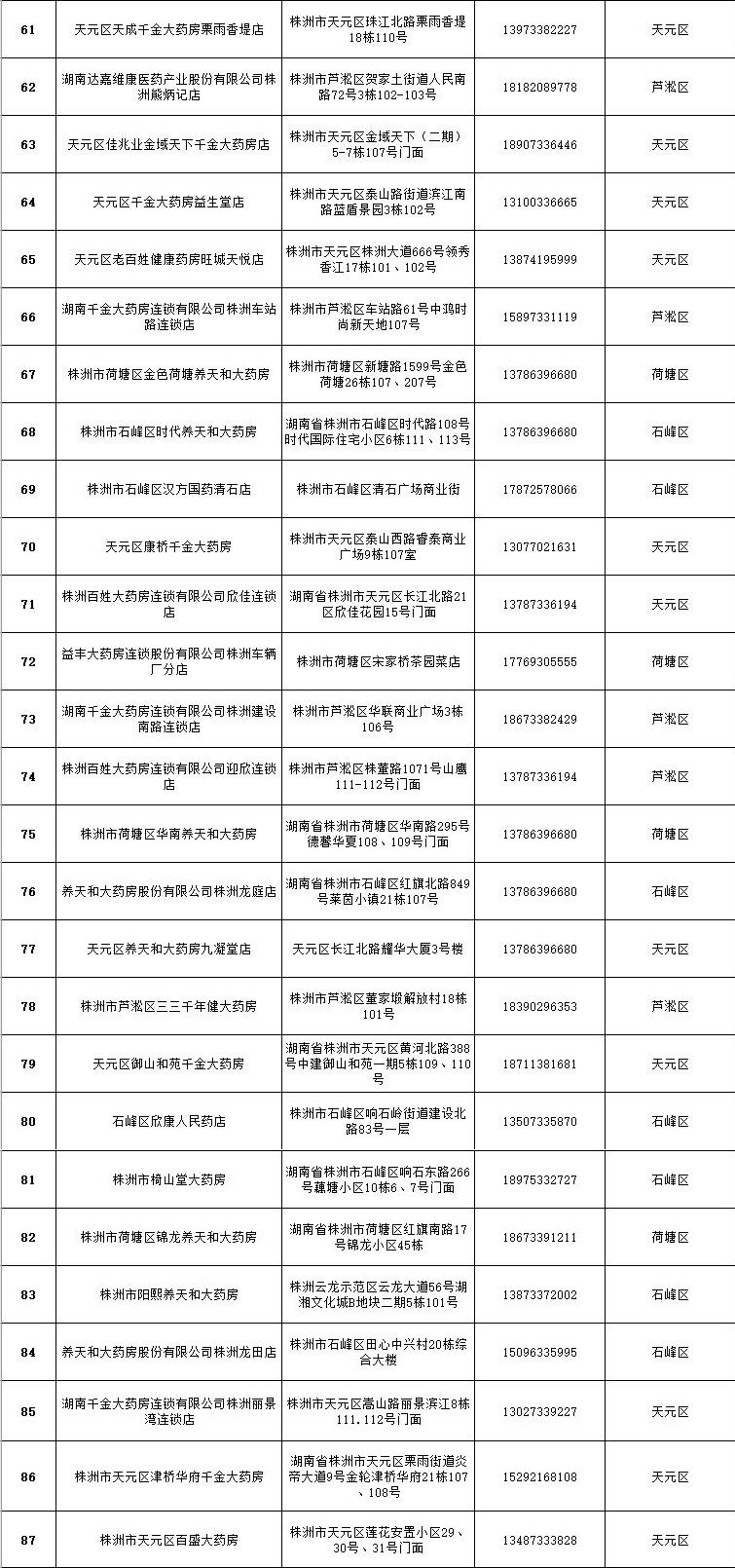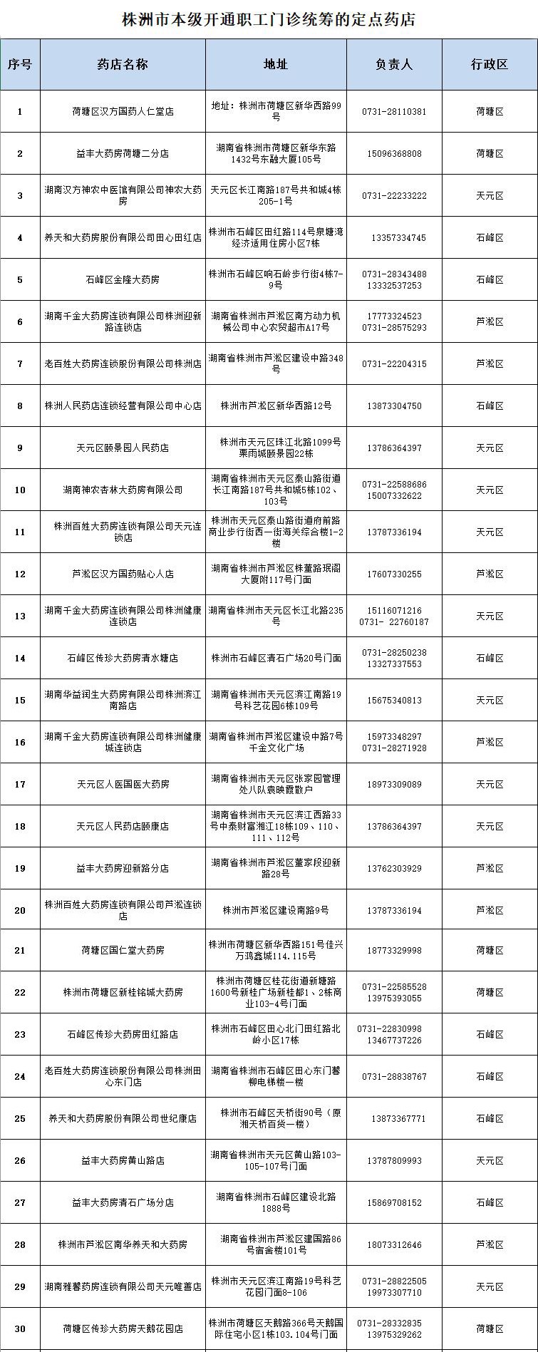 为保障我市参保人员医疗待遇,解决参保人购药不方便等问题,充分发挥我市定点零售药店便民性和可及性,让参保人享受到高效便捷的医疗保障服务。株洲市医保局加速推动定点零售药店纳入门诊统筹管理,在城市四区将87家符合条件的药店纳入市本级“门诊统筹”定点零售药店。具体名单如下: