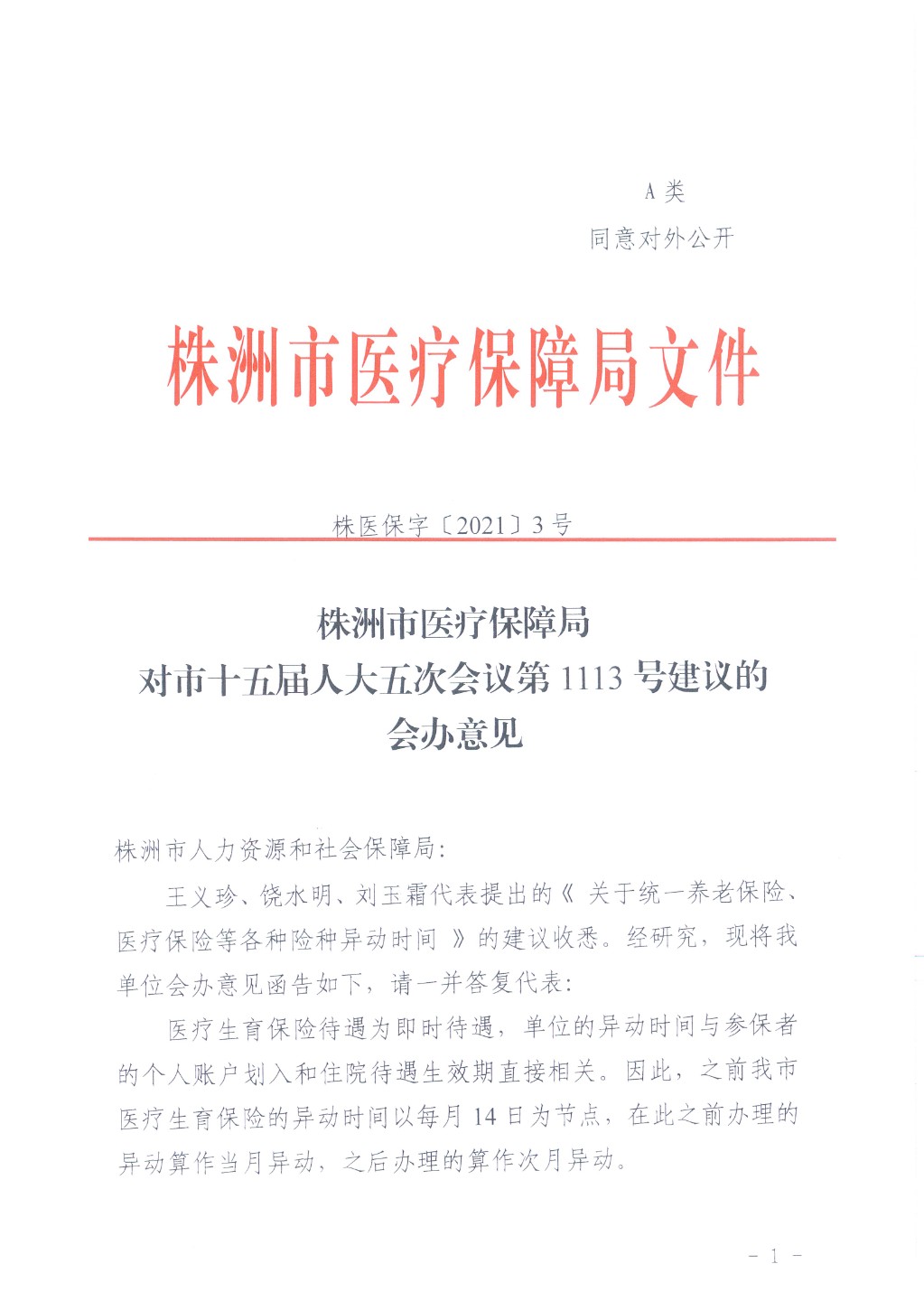 株洲市医疗保障局对市十五届人大五次会议第1113号建议的会办意见