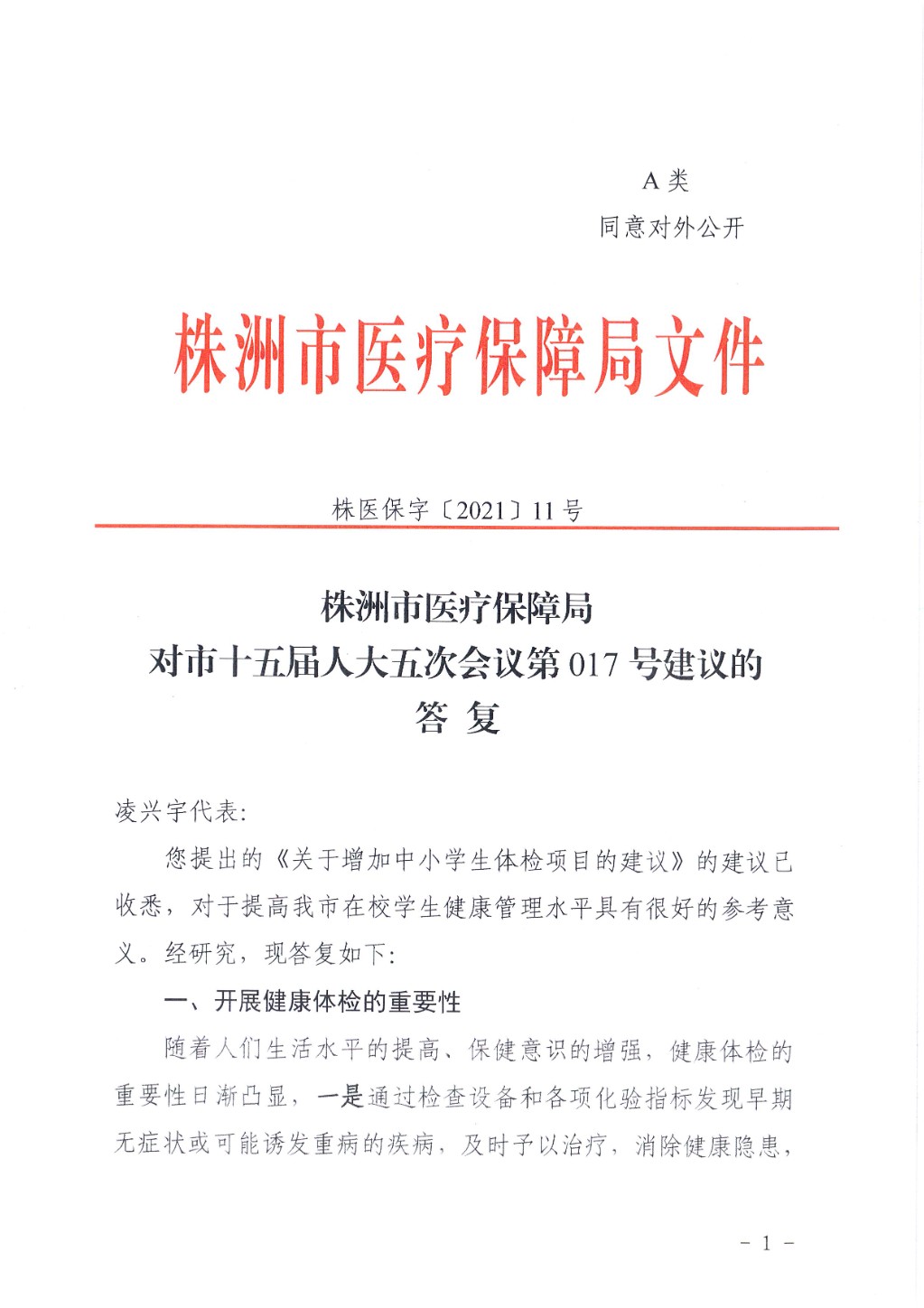 株洲市医疗保障局对市十五届人大五次会议第017号建议的答复