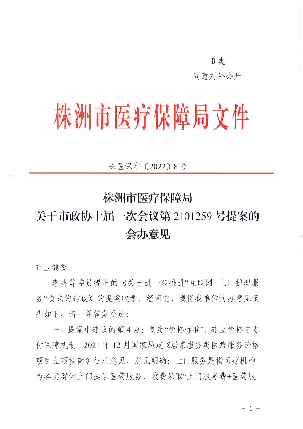 株洲市医疗保障局关于市政协十届一次会议第2101259号提案的会办意见