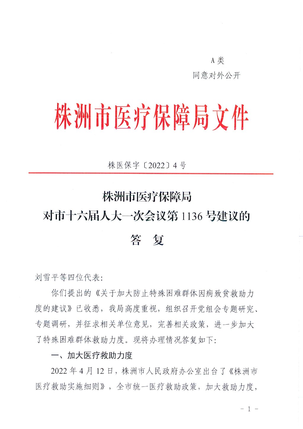 株洲市医疗保障局对市十六届人大一次会议第1136号建议的答复
