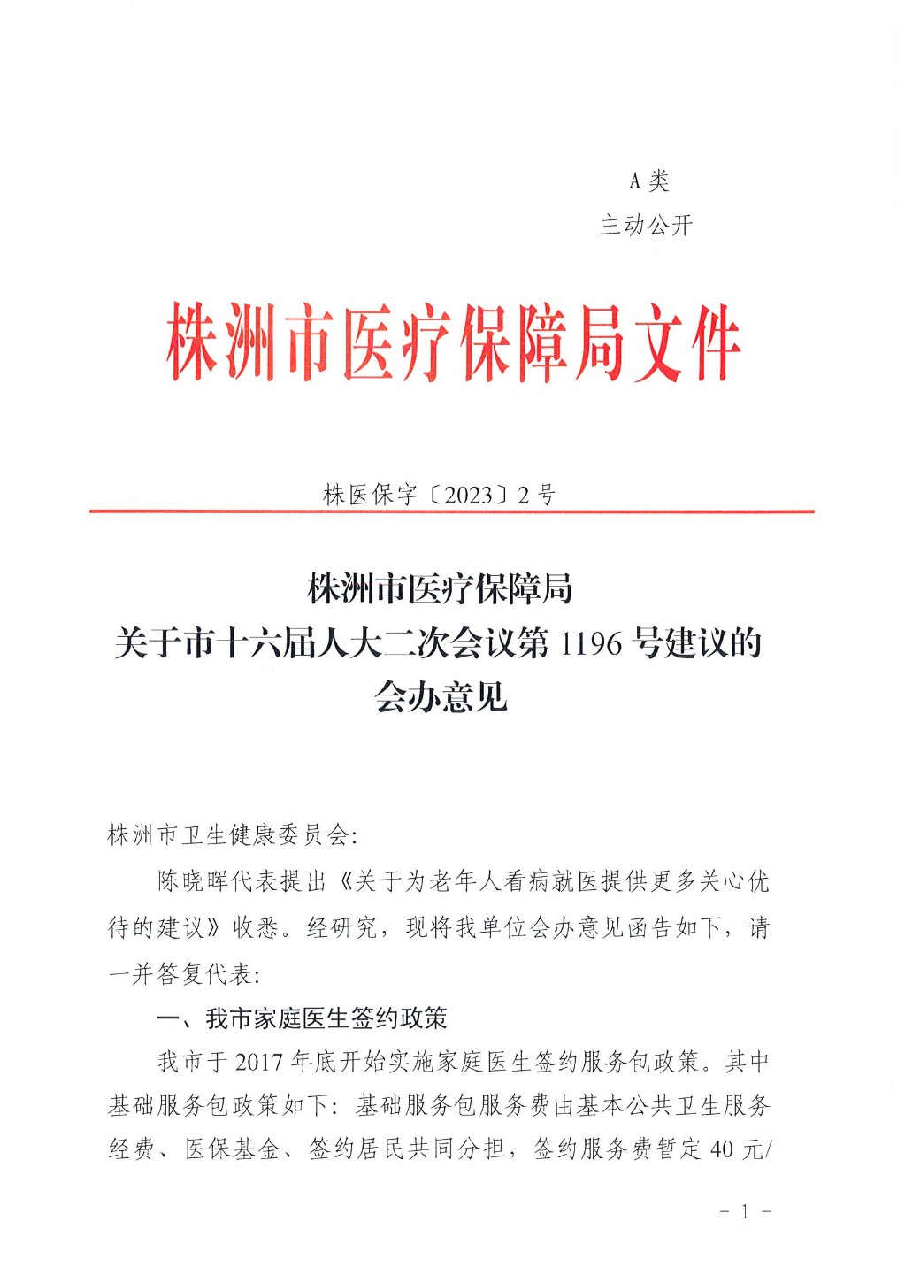 株洲市医疗保障局关于市十六届人大二次会议第1196号建议的会办意见