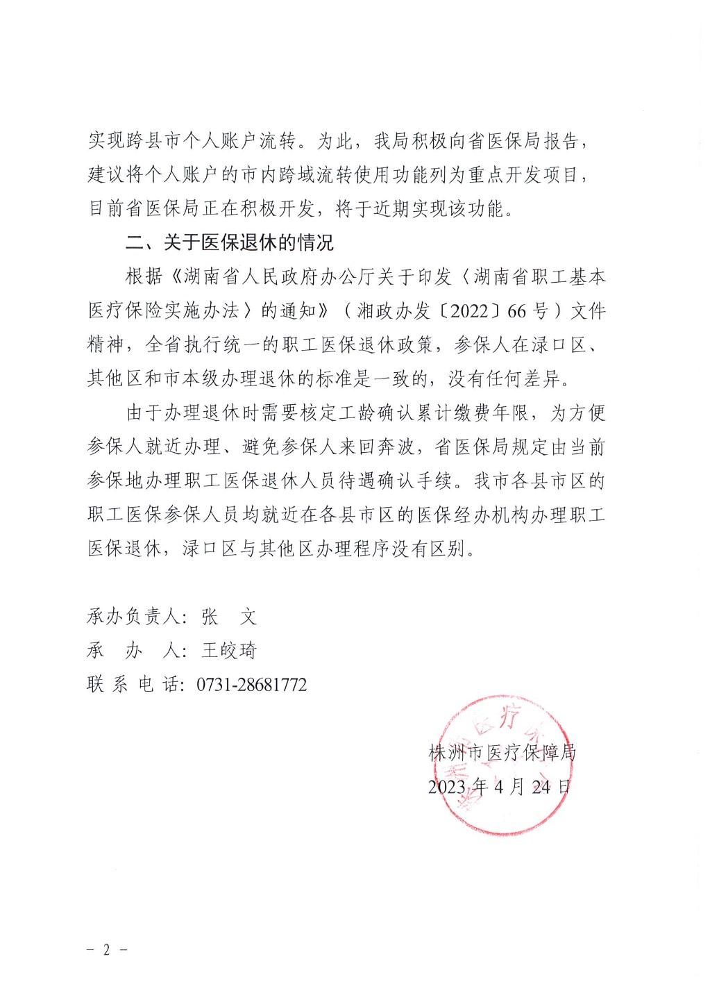 株洲市医疗保障局关于市十六届人大二次会议第1180号建议的会办意见