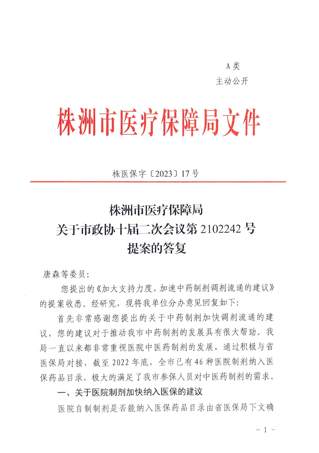 株洲市医疗保障局关于市政协十届二次会议第2102242号提案的答复