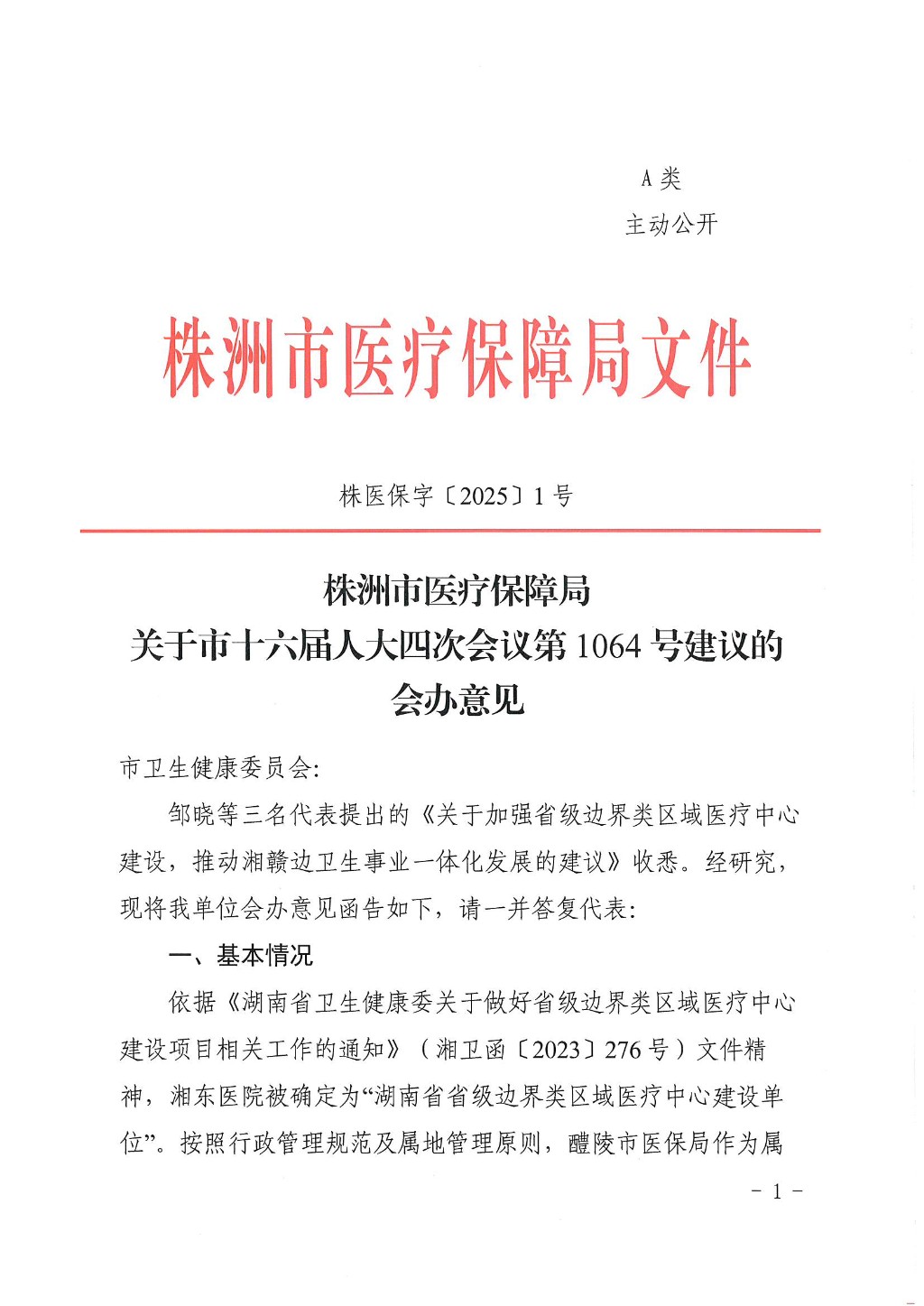 株洲市医疗保障局关于市十六届人大四次会议第1064号建议的会办意见