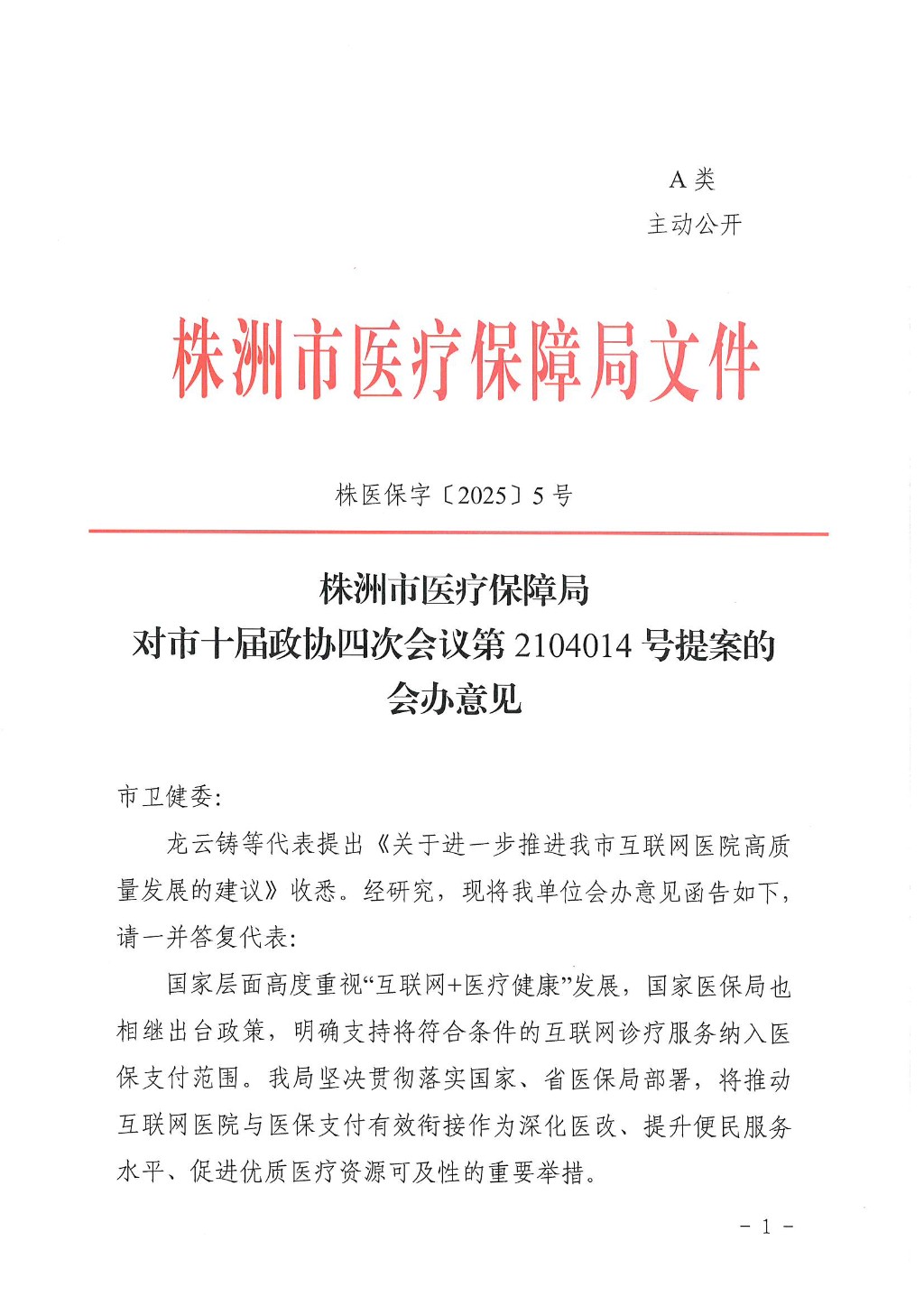 株洲市医疗保障局关于市政协十届四次会议第2104014号提案的会办意见